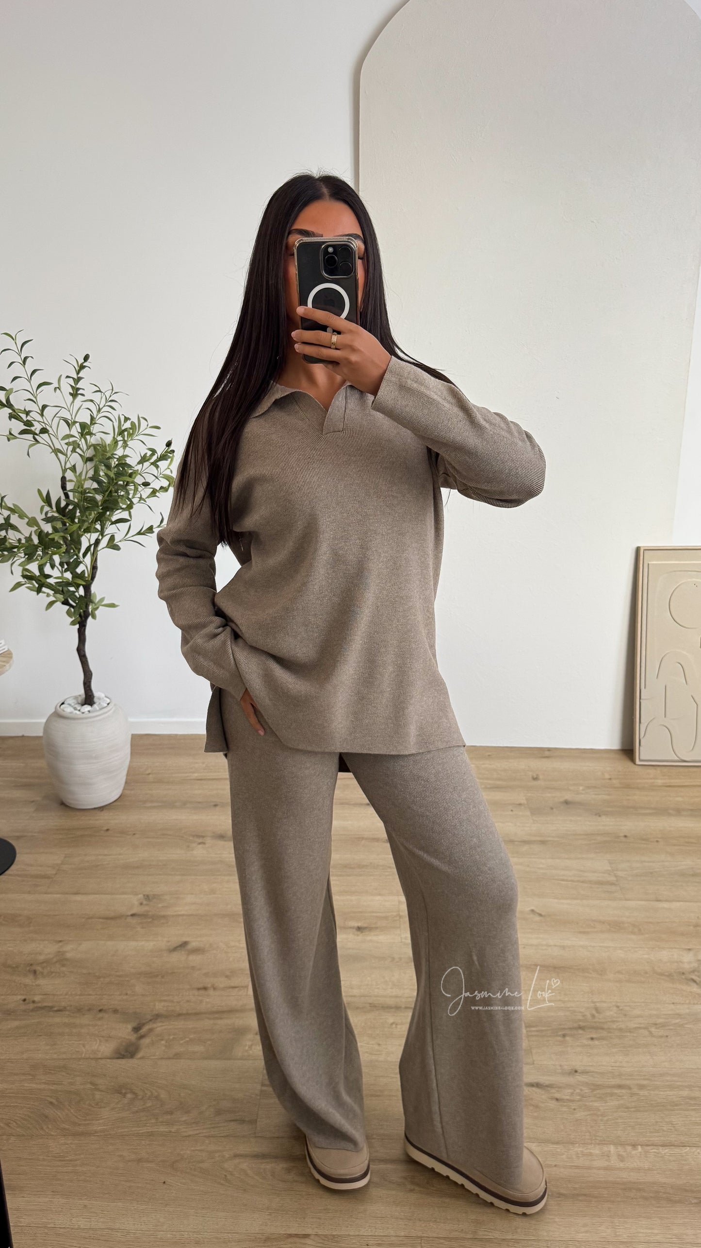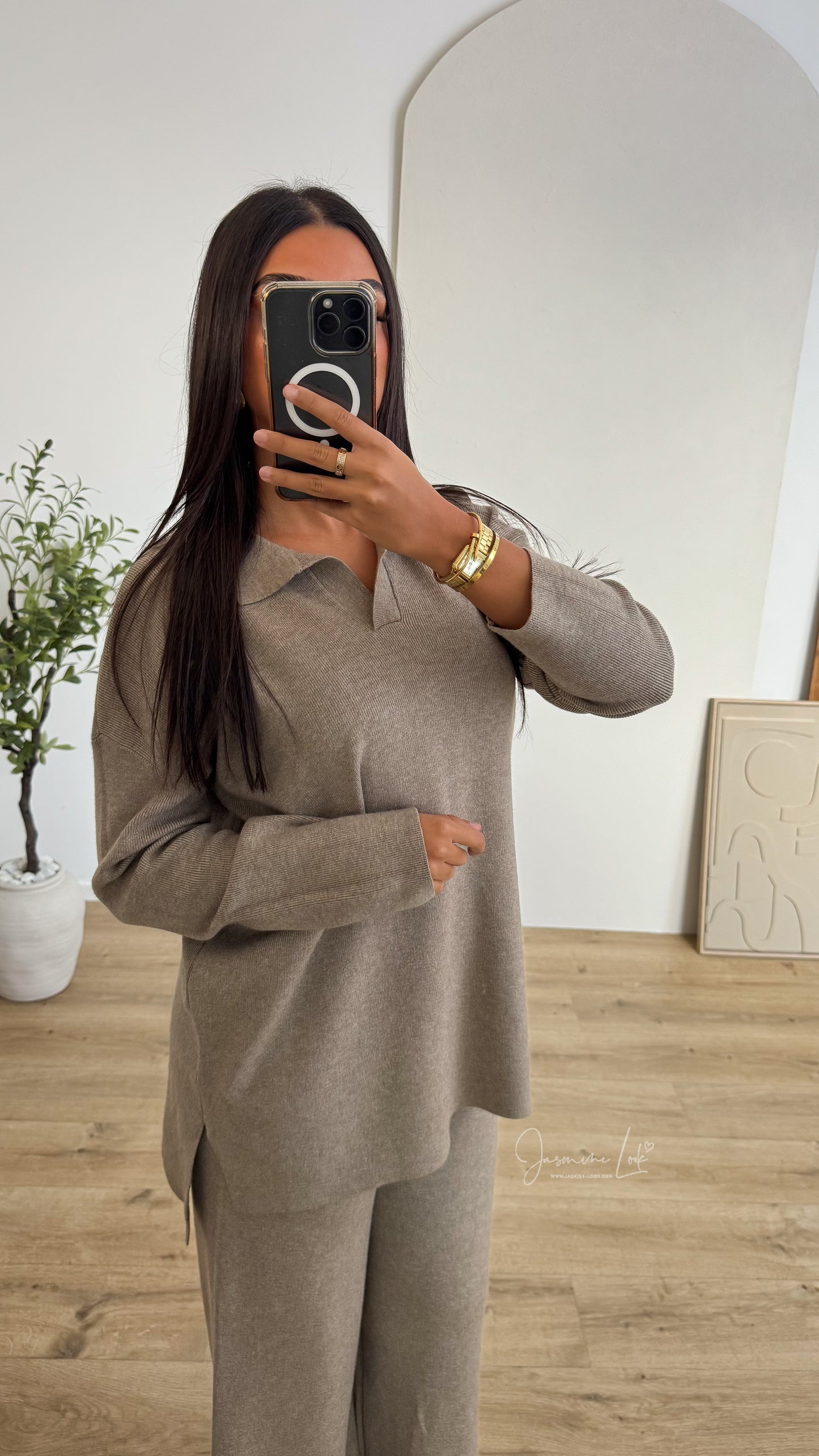 - Ensemble maille douce côtelé avec tunique col polé doublé fente et pantalon taille haute élastique
